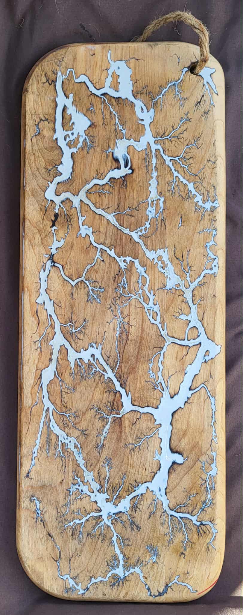 Absolutely gorgeous 100% food safe very large cutting board. Fractal burned with white resin on both sides. Cutting Board / Serving / Charcuterie Board is 100% food safe and are able to use either side. Either side is also a gorgeous way of displaying your different foods for guests at a party.