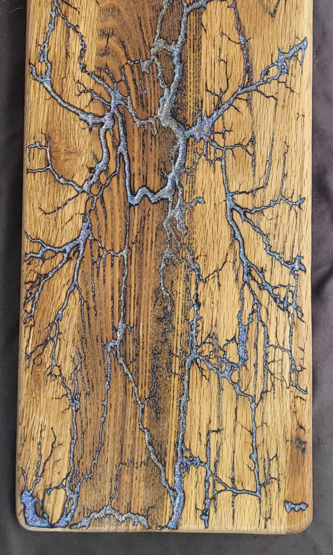 Absolutely gorgeous 100% food safe very large cutting board. Fractal burned with goldish copper on one side, and iridescent silver on the other. Cutting Board / Serving / Charcuterie Board is 100% food safe and are able to use either side. Either side is also a gorgeous way of displaying your different foods for guests at a party.