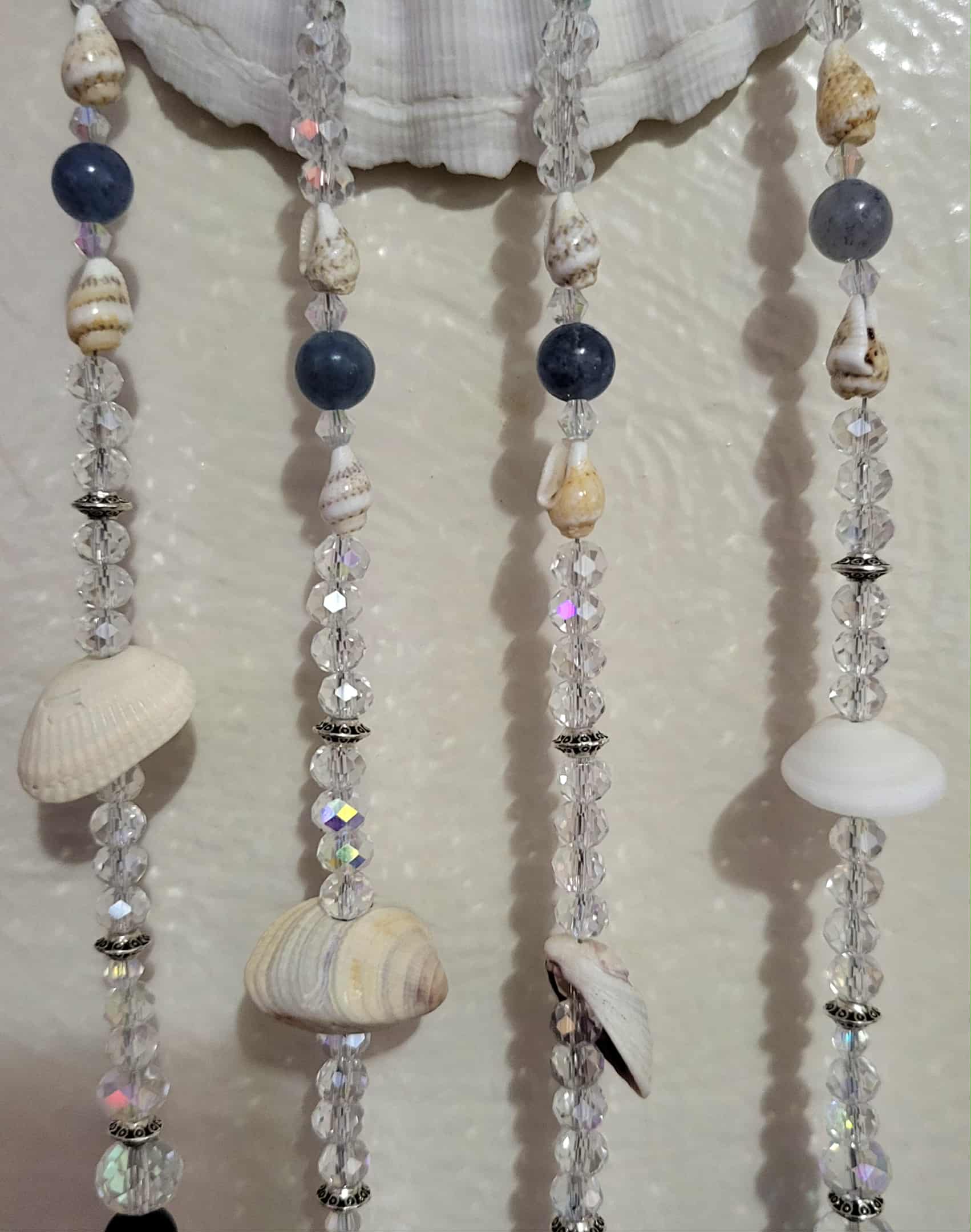 Beautiful seashell suncatcher/ windchimes with shells collected from the Gulf of Mexico. Suncatcher has crystal beads that emit rainbow orbs throughout the room or walls. Beautiful unique sun catcher. Put in any window to add beauty and sparkle. All shells collected from the Gulf. This piece also has blue adventurine stone beads. Blue Adveturine is known for bringing calmness, peace, emotional balance, self discipline, clarity, and inner strength.