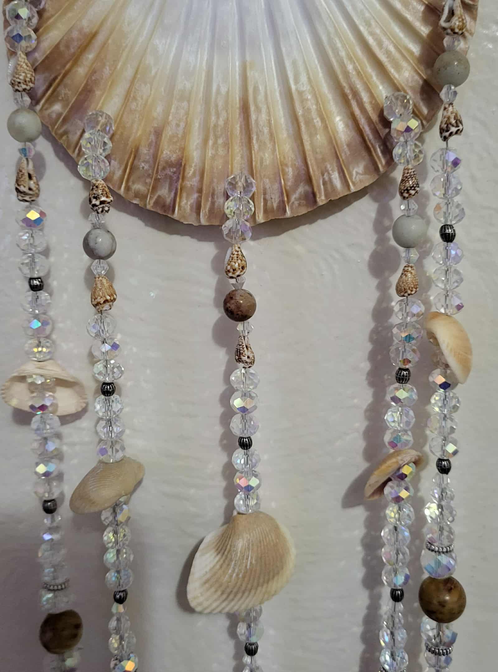 Beautiful seashell suncatcher/ windchimes with shells collected from the Gulf. Suncatcher has crystal beads that emit rainbow orbs throughout the room or walls. Beautiful unique sun catcher. Put in any window to add beauty and sparkle. All shells collected from the Gulf. This piece also has Rainbow Jasper and Amazonite stone beads. Rainbow Jasper is known for grounding, stability, and emotional healing. Amazonite is known for promoting truth and clear communication, enhancing balance and harmony, and soothing the nervous system to relieve stress.
