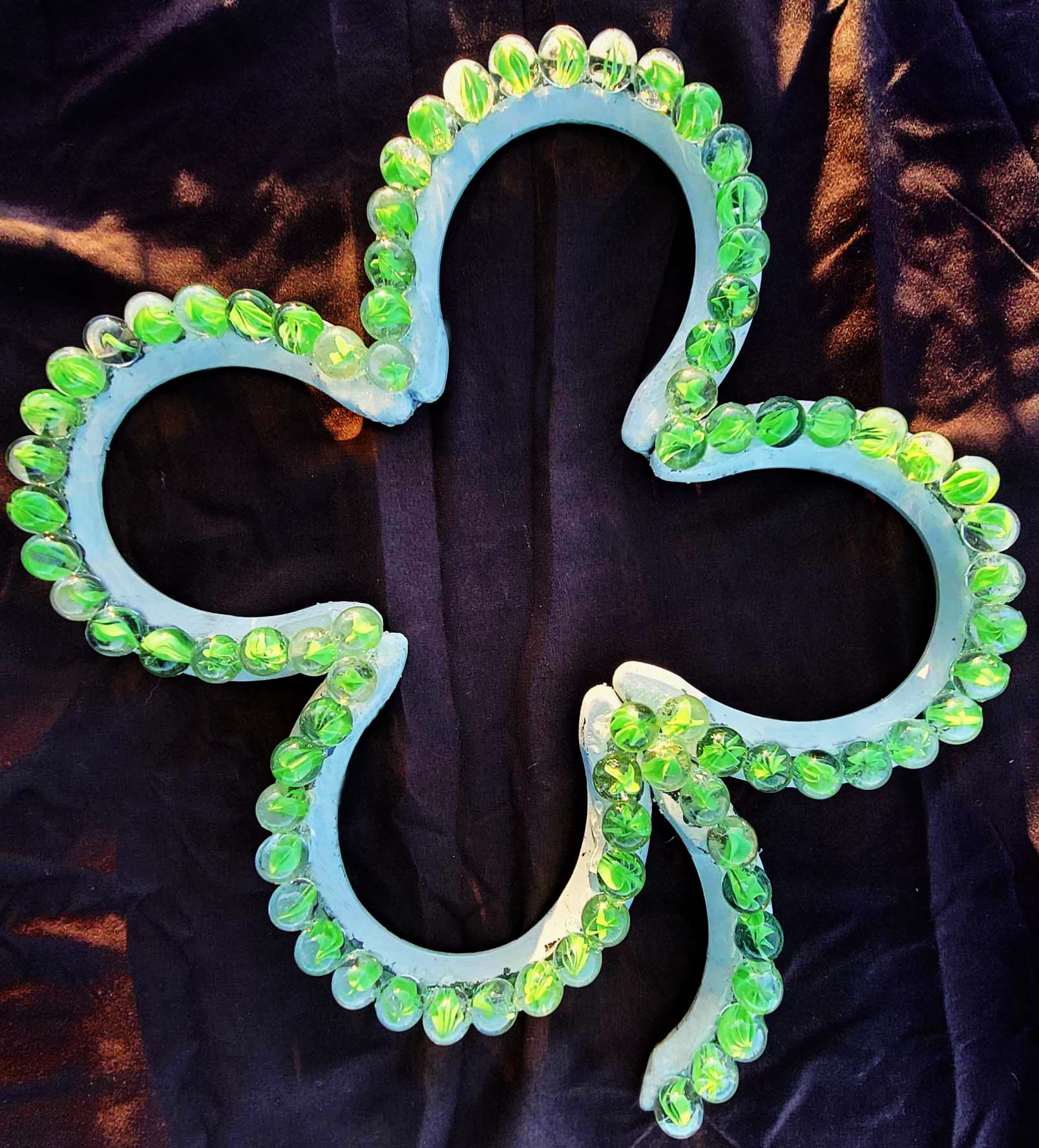 A beautiful way to repurpose an item that was necessary during a period of time. Used horseshoes welded together to make a stunning cross to hang in any room. Painted black. Orange cat's eye marbles used to decorate the interior of the cross.